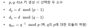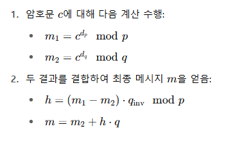 - CRT๋ ์์ ์ p,q (1024๋นํธ ์ดํ)๋ก ๋๋ ์ฐ์ฐํจ → ๊ฐ๊ฐ 4๋ฐฐ ๋น ๋ฅธ ์ฐ์ฐ์ 2๋ฒ ํ๋ฉด ์ ์ฒด์ ์ผ๋ก ์ฝ 4๋ฐฐ ๋น ๋ฅธ ๊ฒฐ๊ณผ.
